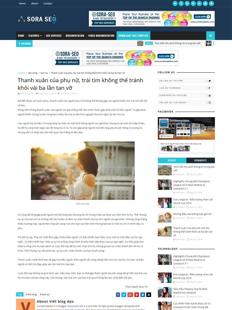 Sora Seo Template là mẫu giao diện cho blogspot chuẩn SEO, thân thiện với thiết bị di động, có nhiều shortcode hỗ trợ trình bày bố cục bài viết chuyên nghiệp, tinh tế. Đặc biệt mẫu giao diện này được cộng đồng Blogger ưa chuộng.Tính năng nổi bật: