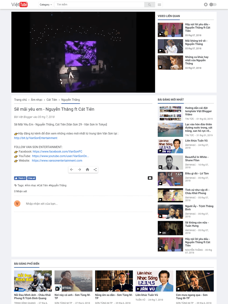 Việt Blogger Video Template là mẫu template có giao diện đơn giản load nhanh với mục đích sưu tầm các video trên YouTube về một hay một vài chủ đề nào đó ví dụ như: Khám phá, Thế giới động vật..., sau đó dựa vào chủ đề đó sưu tầm viết nội dung. Ngoài ra theme này còn hỗ trợ bài viết cho một nhãn đặc biệt... TÍNH NĂNG GIAO DIỆN: Tính năng Test Layout Version 3 Widget Version 2 Reponsive Check Mobile Friendly Check BreadcrumbList Check Sitemap Page Check Contact Page Check 404 Page Check Dark theme True Related Recent Posts True Recent Posts Widget True Recent Comments Widget True Popular Posts Widget True Label Widget True Ads Banner Widget True Live search True Reponsive video True