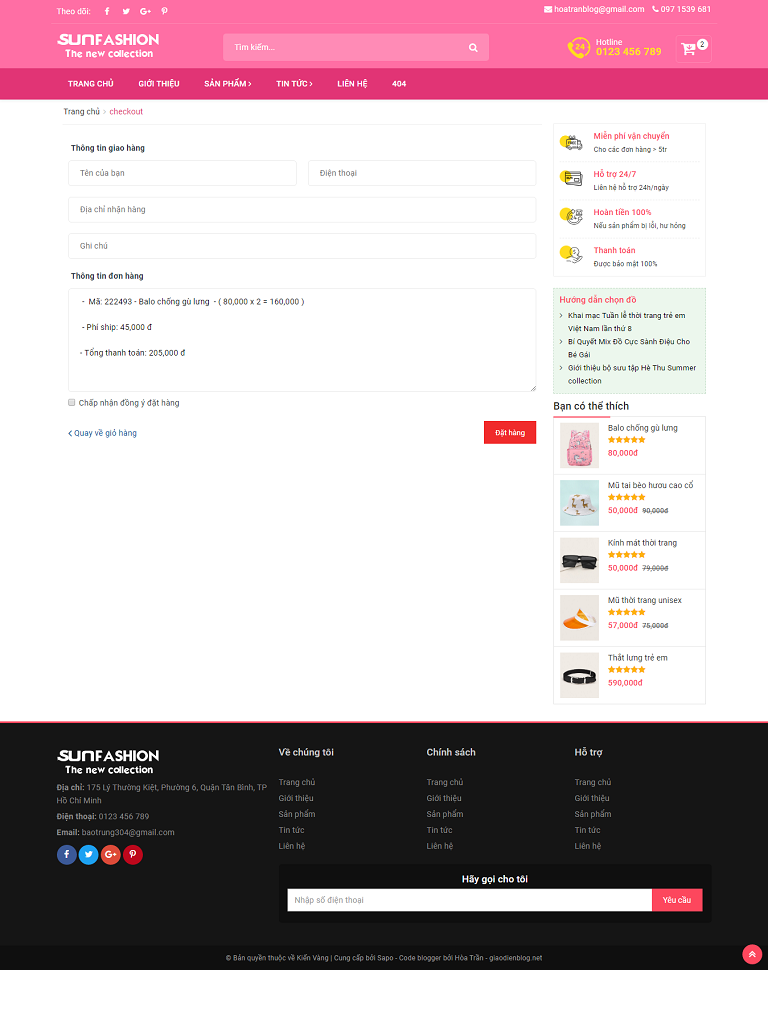Đây là một mẫu blogspot bán hàng thời trang đẹp, thiết kế chuẩ mobile, tích hợp giỏ hàng online, đặt hàng trực tiếp trên website. Code được tối ưu tốc độ load nhanh, giao diện blog thiết kế đẹp thích hợp bán các mặt hàng như: thời trang, mỹ phẩm, giày dép... Một số điểm nổi bật của mẫu: Giao diện bootstrap chuẩn responsive Giao diện mới nhất bên blogspot Tích hợp giỏ hàng mini dễ thao tác. Tự động tính % giảm giá Tự động tính số tiền giảm giá Bố cục layout đã được thiết kế theo từng mục dễ quản lý Tối ưu thẻ H1